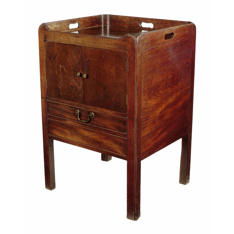 A George III mahogany tray-top bedside commode, the gallery pierced with three handgrips above a cupboard and a pull-out base with a turned lid and a ceramic pot, 81.2cm high, 54.4cm wide, 49cm deep.