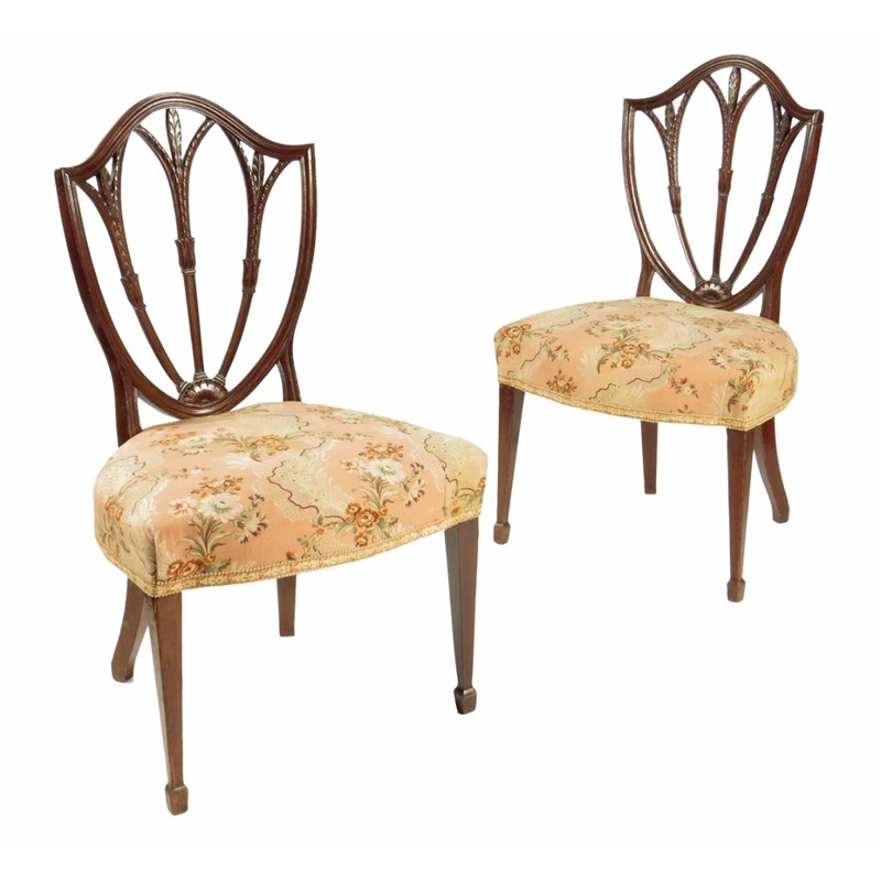 A pair of George III mahogany sidechairs, each with a moulded shield shaped back, splats carved with sheaves of wheat, the stuffed-over seat on square tapering legs and spade feet. (2)