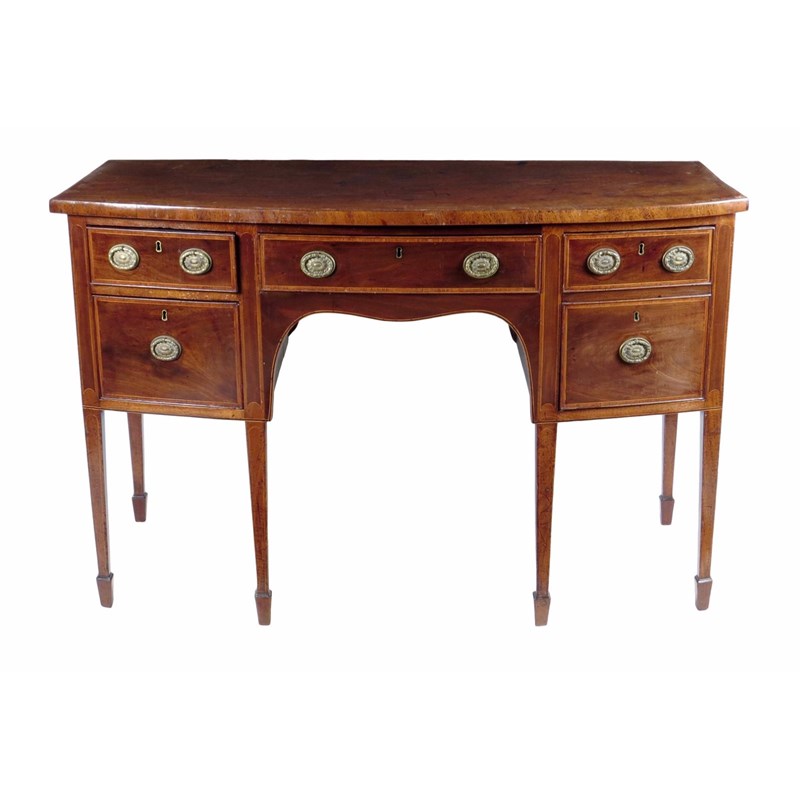 A small George III mahogany bowfront sideboard, inlaid with boxwood stringing and kingwood banding, with a central frieze drawer, a deep cellaret drawer to the right and two further drawers to the left, on tapering legs and spade feet, 89.4cm high, 137.2cm wide, 66.4cm deep.