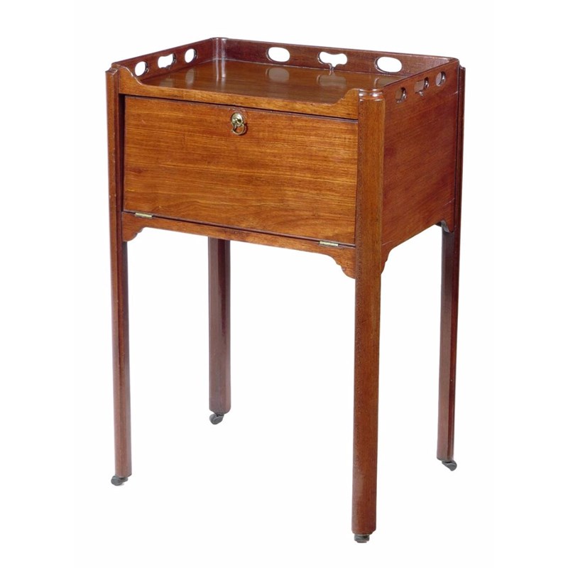 A George III tray-top bedside cupboard, the pierced gallery with three handgrips above a hinged fall-front door on moulded legs and leather roller castors, 75.8cm high, 50.7cm wide, 38cm deep.