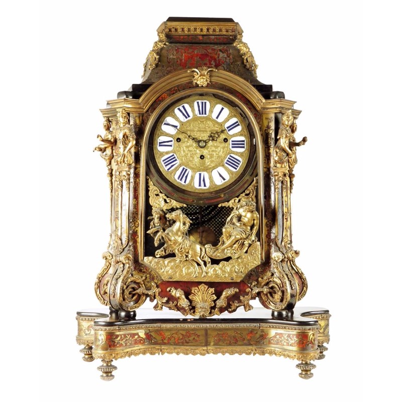 λ A French brass and tortoiseshell boulle marquetry mantel clock, with an associated English eight day, three train musical movement, striking on nine bells and a gong with a 9.5cm pinned cylinder, the engraved backplate signed 'J. Elliott, LONDON', the gilt brass and white enamel dial with Roman numerals, with 'strike / silent', the gilt brass and ebonised case, with a rising top and with figural mounts including: a chariot drawn by two horses, on a stand, 82cm high, 61cm wide, 26cm deep.