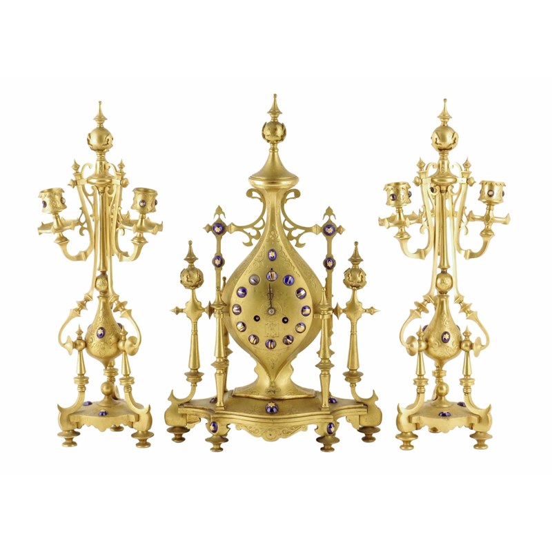 A late 19th century ormolu clock garniture, the eight day movement striking on a bell, the backplate signed with initials 'H F' and 'Cie Paris', stamped '128', with a blue enamel dial with Roman numerals engraved with a coronet and a cypher 'DSD', and 'LONDON & RYDER 17 NEW BOND STREET', the tear drop shape Gothic style skeleton case applied with blue enamel and gilt cabouchons, 44cm high, 27cm wide, together with a pair of matching three light candelabra. (3)