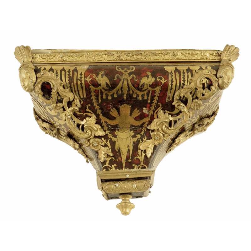 A French brass and tortoiseshell boulle marquetry clock bracket, 23cm high, 34.8cm wide.