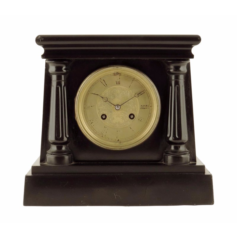 A late 19th century French black slate mantel clock, the eight day movement striking on a bell by Jean-Baptiste Delettrez, stamped 'JBD' and numbered '29236 14', with a gilt brass dial with Roman numerals and worn retailers name and with an unusual hand adjuster below 6 o'clock, in an architectural case, 24.7cm high, 27.5cm wide, 14cm deep.