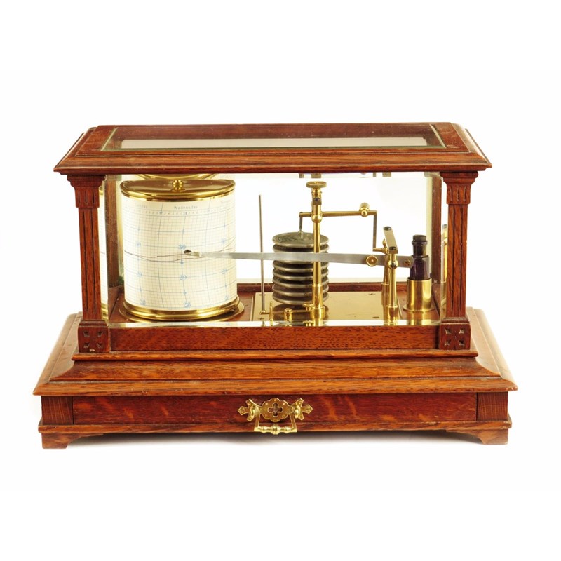 An oak barograph by Short & Mason, the eight aneroid movement flanking a recording drum with maker's plaque inscribed 'SHORT & MASON, LONDON', the glazed case with fluted columns, the base with a divided drawer containing charts, 23cm high, 38cm wide, 23cm deep.