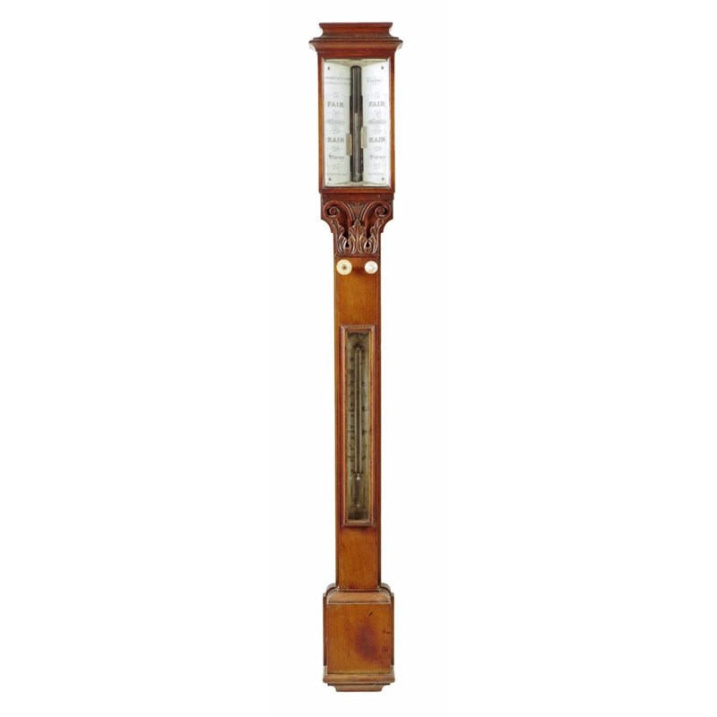 λ A Victorian walnut stick barometer by Negretti & Zambra, with twin ivory dials, signed 'NEGRETTI & ZAMBRA Inst Makers To The Queen London', 10 A.M. Yesterday' and '10 AM ToDay' with vernier scales, the case carved with a leaf and scroll capital with ivory adjusters and a thermometer, 99cm high.