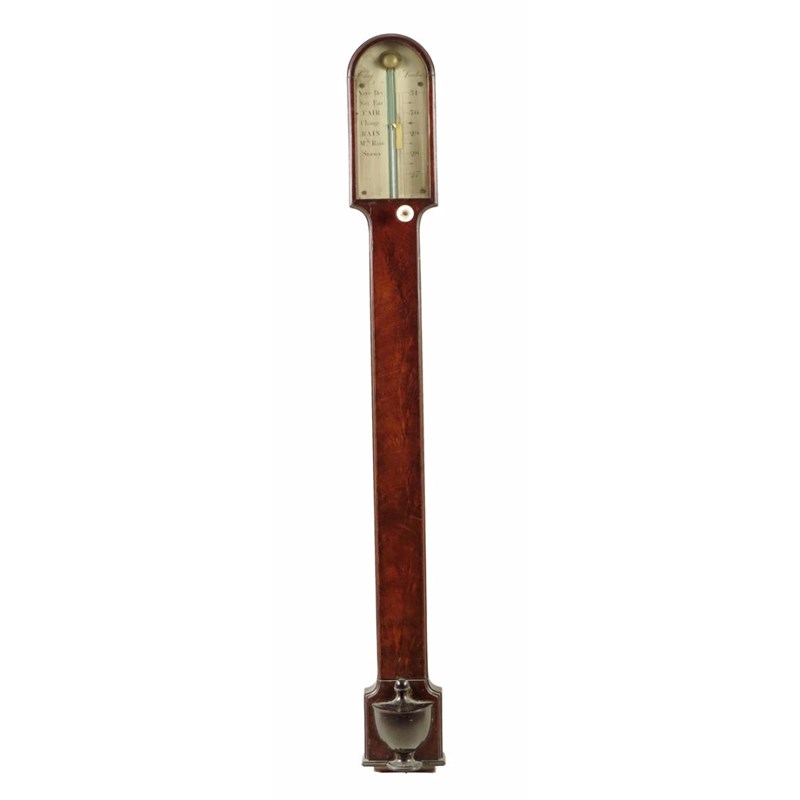 λ A George III mahogany stick barometer by Cary, the silvered arch dial inscribed 'Cary London', with a brass vernier scale, the moulded case with an ivory adjuster, the base with an ebonised urn cistern cover, 95cm high.
