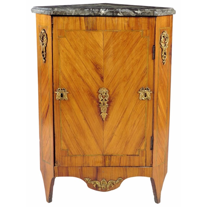 A Louis XVI tulipwood encoignure, with a grey marble top, above a door enclosing two shelves,90.5cm high, 61.7cm wide, 39cm deep.