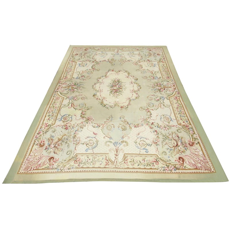 A large Aubusson style woven carpet in Louis XVI style, decorated with a central medallion of flowers, with foliate borders and corner trophies, 421 x 610cm.