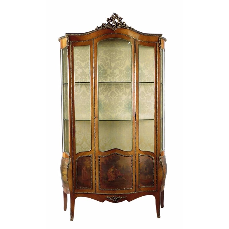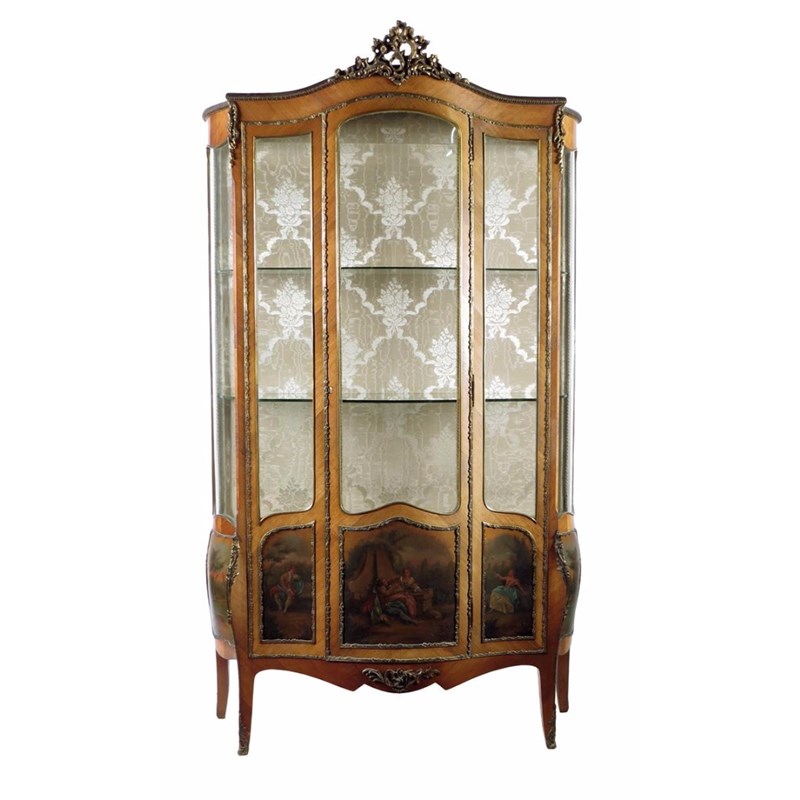 A near pair of French kingwood and Vernis Martin serpentine vitrines in Louis XV style, with gilt brass mounts, each with a single door enclosing a damask silk lined interior with two shelves, each with painted panels of amorous lovers and landscapes, early 20th century, 206cm high, 117.6cm wide, 45.3cm deep. (2)