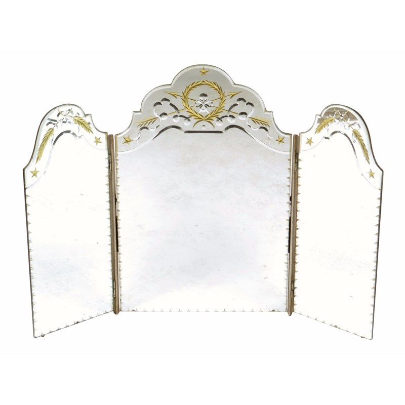 A Venetian triptych dressing table mirror, with etched parcel gilt decoration with stars, a laurel wreath, arrows and ribbon tied scrolls, 71cm high.