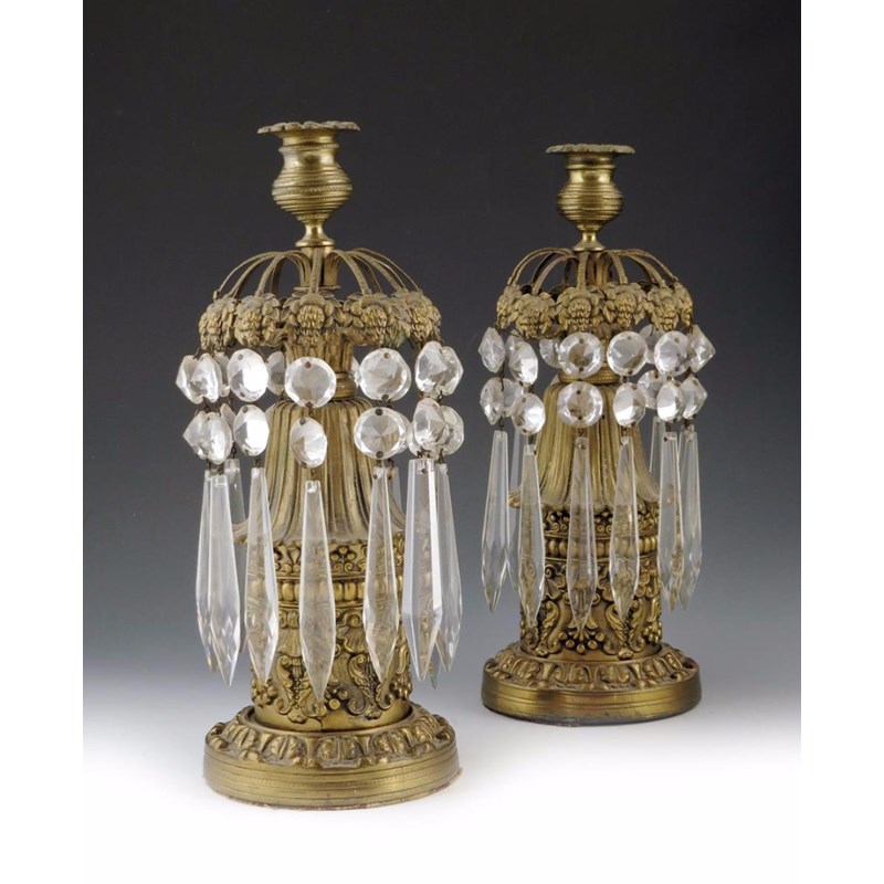 A pair of Regency gilt brass candlesticks, hung with cut glass drops and lustres, the bases decorated with shells and anthemion motifs, 31.5cm high. (2)