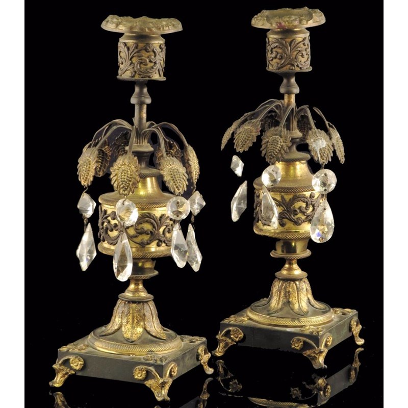 A pair of Regency gilt and patinated brass and bronze candlesticks, each decorated with scrolling leaves and flowers and hung with faceted lustres, on scroll feet, 27.5cm high. (2)