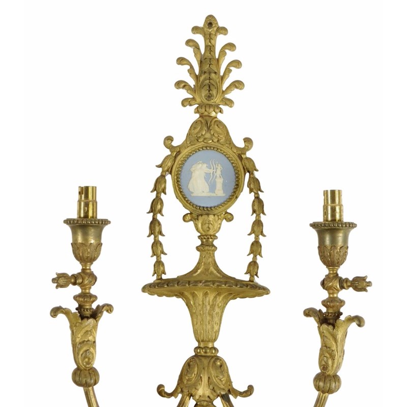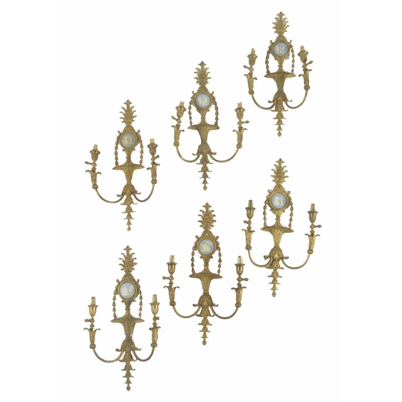 A set of six 19th century gilt brass twin branch wall lights of neo-classical design, each with a palmette and husk decorated backplate inset with a Wedgwood jasperware rondel, with leaf decorated scroll arms and stiff leaf and bead nozzles, 53.3cm high, 32cm wide. (6)