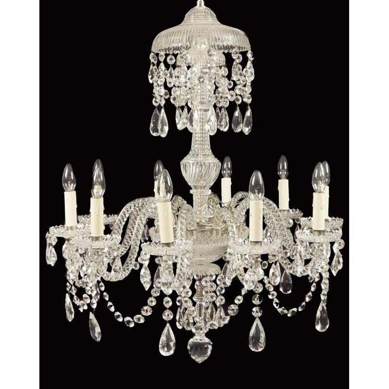 A 19th century cut glass chandelier, with a ribbed corona hung with drops, above a spiral fluted baluster stem, with ten scroll arms hung with swags of lustres and drops, above a faceted ball pendant, possibly Irish Waterford crystal, 107cm high, 79.5cm wide.