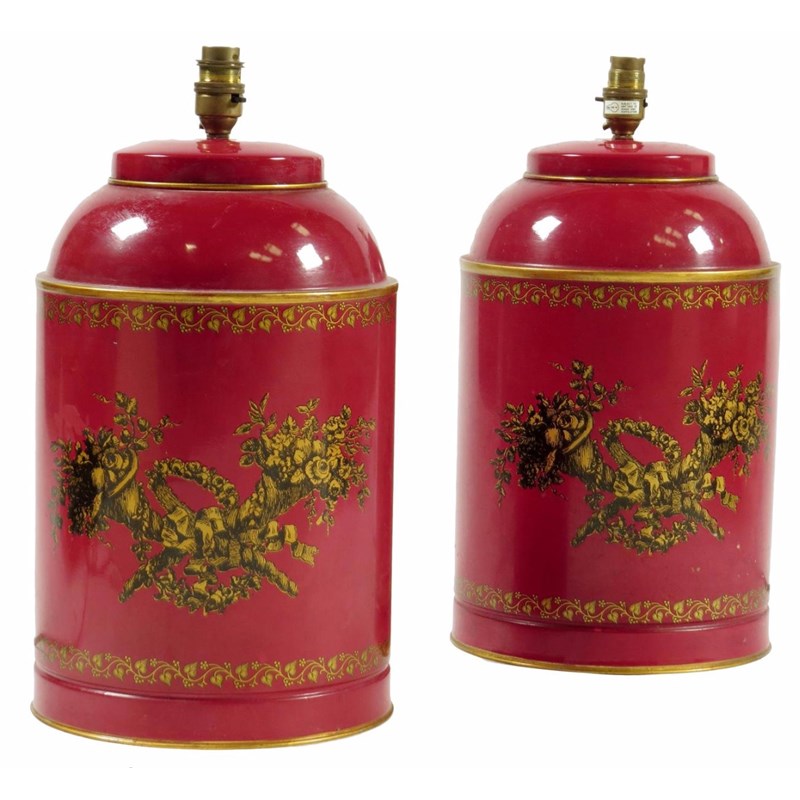 A pair of Italian tole tea canister style table lamps, decorated in gilt with ribbon tied cornucopiae, modern, 41cm high, with pleated silk shades. (4)