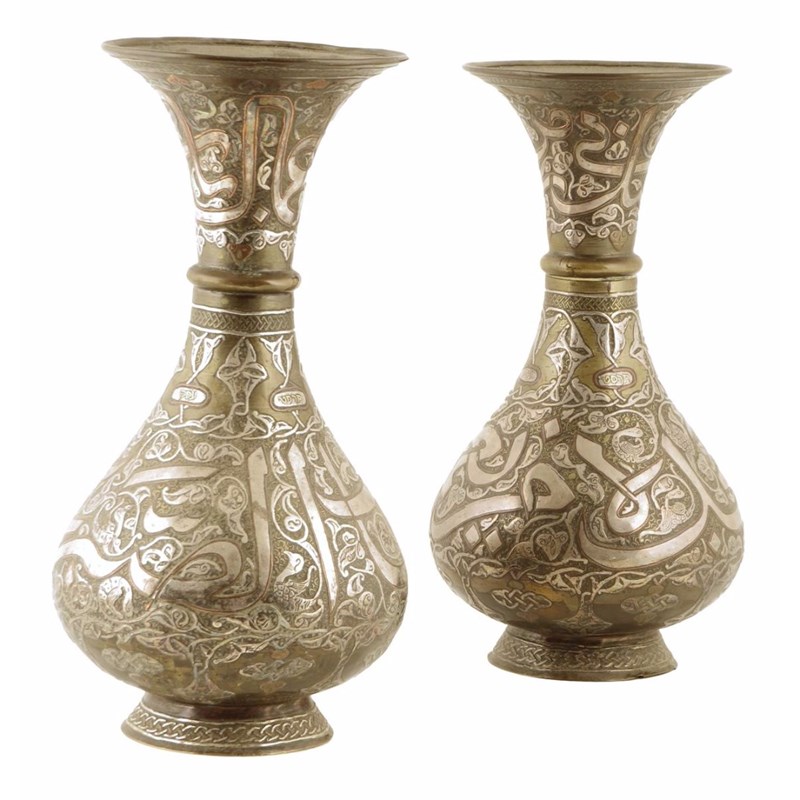 A pair of Islamic Cairo ware ovoid vases in Mamluk style, of brass, copper and white metal decorated with panels of scrolling leaves and script, late 19th / early 20th century, 27.1cm high. (2)