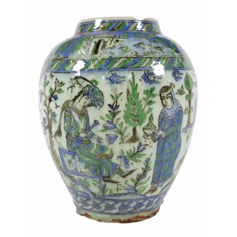 A Qajar pottery vase, decorated with birds and animals, with a band of figures in various pursuits, probably 19th century, 27.8cm high.