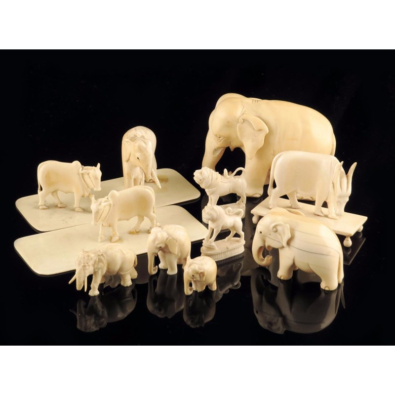 λ A small collection of ivory carvings of animals, comprising: five elephants, two lions, two oxen on plinths and an ox and an elephant on a plinth base, late 19th / early 20th century, 7cm high (max). (10)