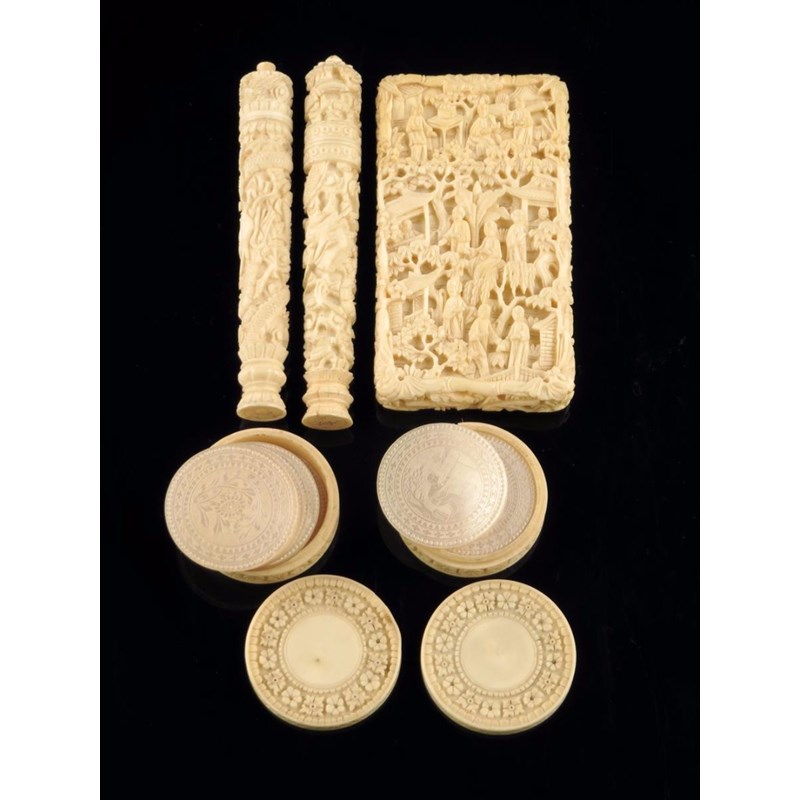 λ A Chinese carved ivory card case, decorated with figures, buildings and trees, two Chinese carved ivory needle cases and a pair of Chinese ivory counter boxes, each containing six engraved mother of pearl counters, all 19th century, 5.3cm high (max). (5)