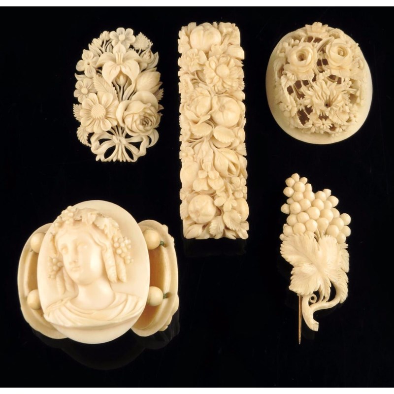 λ Three carved ivory portrait cameos, of classical ladies, three carved ivory floral brooches and a carved ivory basket of flowers, 19th century, 7.5cm wide (max). (5)
