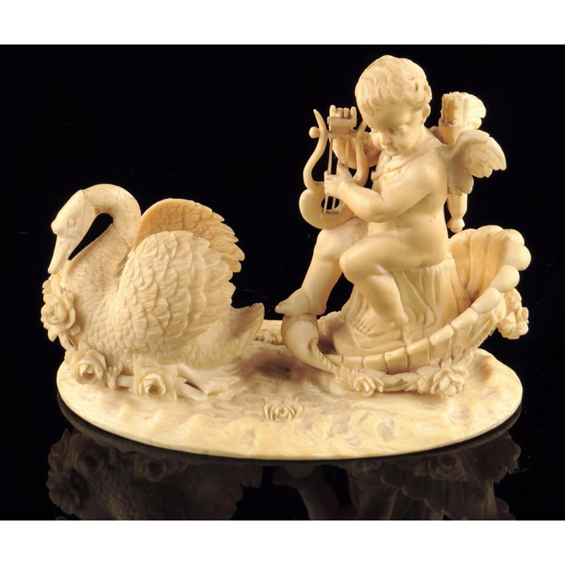 λ A European carved ivory group of Cupid and a swan