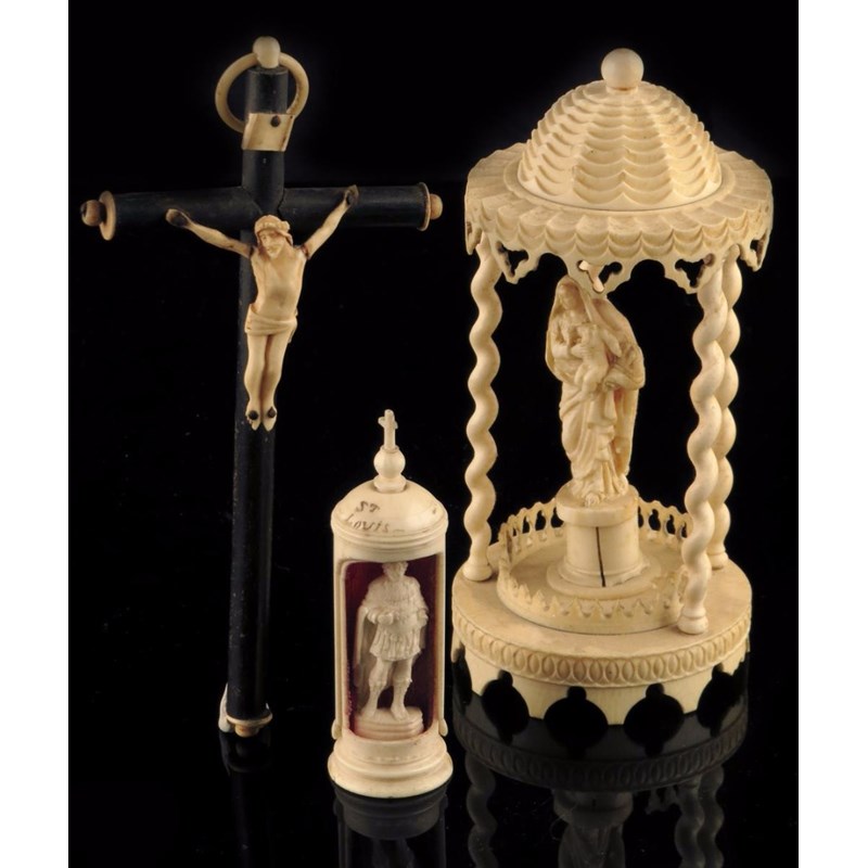 λ A 19th century European carved ivory group of the Madonna and child, standing on a plinth under a canopy / baldacchino with Solomonic columns, 14cm high, together with a carved bone figure of St Louis standing in a niche and a carved ivory / bone Corpus Christi on an ebonised cross. (3)