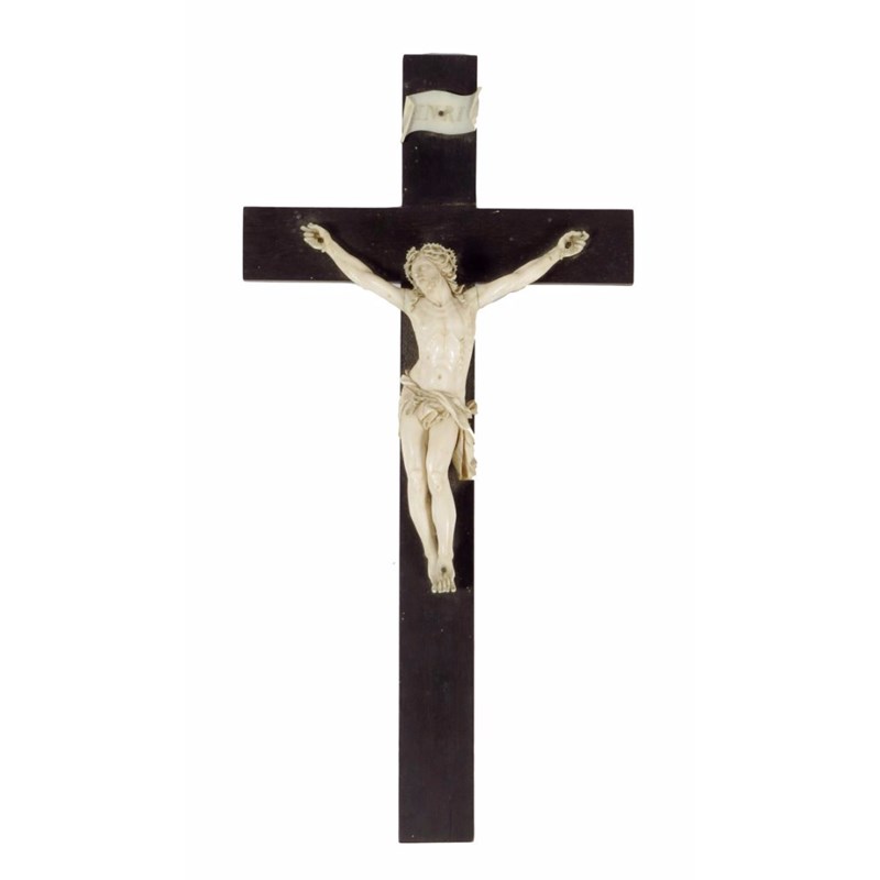 λ A 19th century carved ivory Corpus Christi, mounted on an ebony cross, the figure: 16.5cm x 13cm, the cross: 36 x 17.5cm.