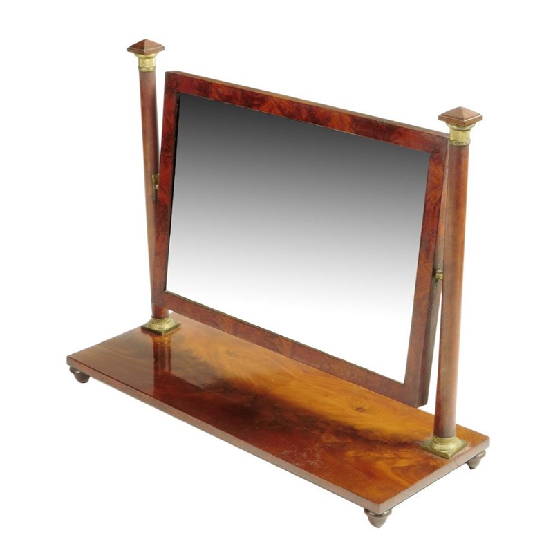 A Regency mahogany dressing table mirror by William Wilkinson, the rectangular plate within a flame veneered frame with turned column supports with engine turned gilt brass capitals and plinths, the base stamped 'WILKINSON. LUDGATE HILL 14110', 64cm high, 78.2cm wide, 29cm deep.