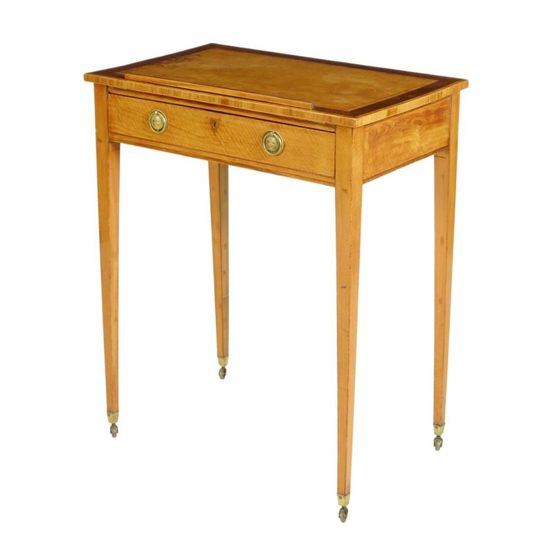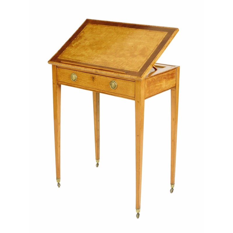 A George III satinwood lady's writing table, the hinged top on a ratchet, with kingwood and harewood crossbanding, with a detachable rest above a cedarwood lined frieze drawer, on square tapering legs and brass caps and castors, 71.6cm high, 56.8cm wide, 36cm deep.