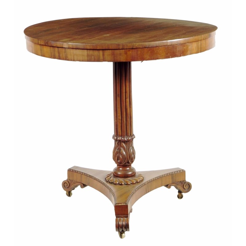 A George IV goncalo alves occasional table in the manner of Gillows, the circular fixed top on a ribbed stem with a leaf carved base on scroll feet and brass castors, 76.5cm high, 75.5cm diameter.