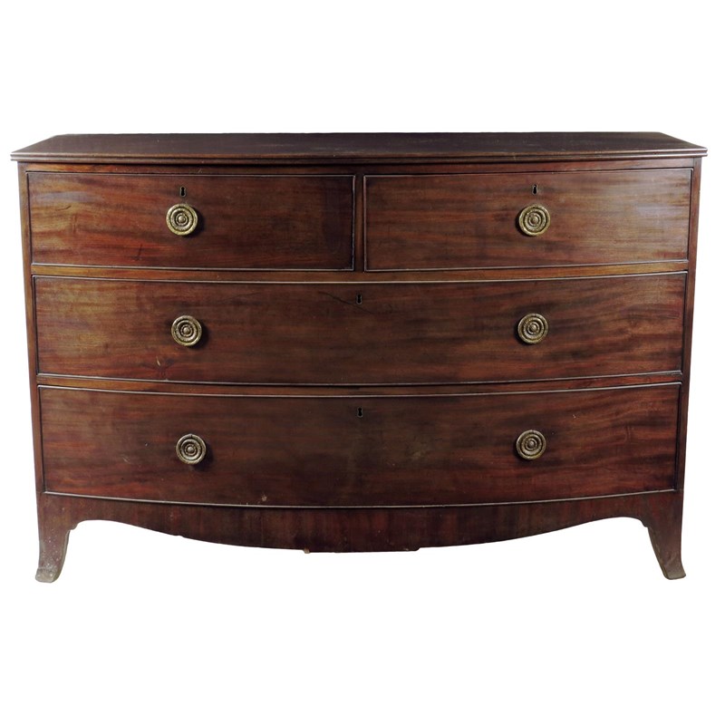 A large Regency Irish mahogany bowfront chest, the top with a reeded edge above two short and two long drawers on French bracket feet, 98cm high, 150cm wide, 59.5cm deep