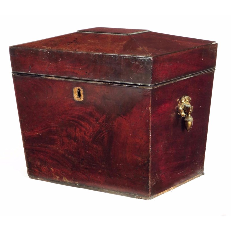 A William IV mahogany sarcophagus shape wine cooler, the lead lined interior with six divisions with gilt brass acorn and rosette side carrying handles, 35.4cm high, 40cm wide, 28cm deep.