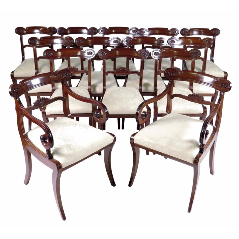 A set of fourteen George IV mahogany dining chairs in the manner of Gillows, each with a moulded toprail carved with rosettes above a scroll and gadrooned horizontal splat with a drop-in seat on sabre legs, some seat rails with workman's initials 'I.S.', comprising: a pair of open armchairs and twelve side chairs. (14)