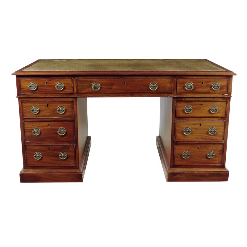 A Victorian mahogany twin pedestal desk, the top with a moulded edge and inset with a gilt tooled green leather above an arrangement of nine drawers, the reverse with a pair of cupboard doors, on castors, 76.5cm high, 142cm wide, 78.2cm deep.