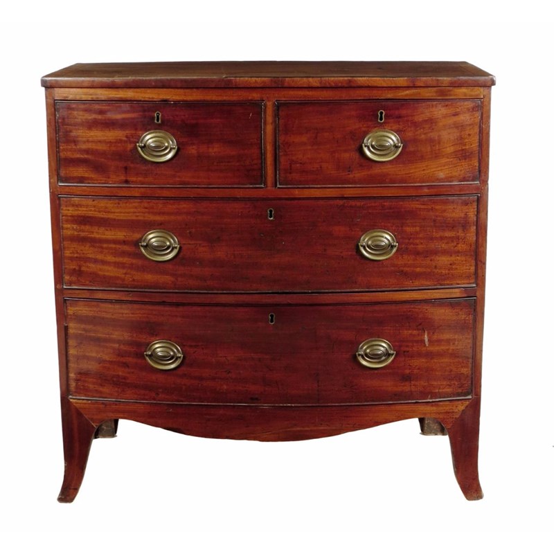 A Regency mahogany bowfront chest, the crossbanded top above two short and two long drawers, 90.5cm high, 91.5cm wide, 46.5cm deep.
