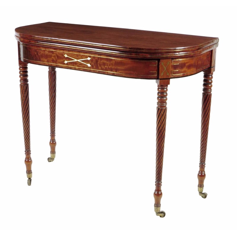 A Regency mahogany and brass inlaid 'D' shape tea table, on turned and spiral twist tapering legs and brass castors, possibly Scottish, 74.4cm high, 90.5cm wide, 43.7cm deep.