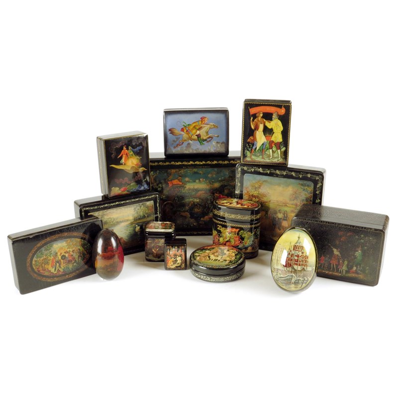 A collection of Russian lacquer items, with boxes and two eggs, painted with fairy tale scenes, landscape views, a hunting scene and a winter landscape view of figures, the majority signed and dated, late 20th century, 20.2cm wide (max). (14)