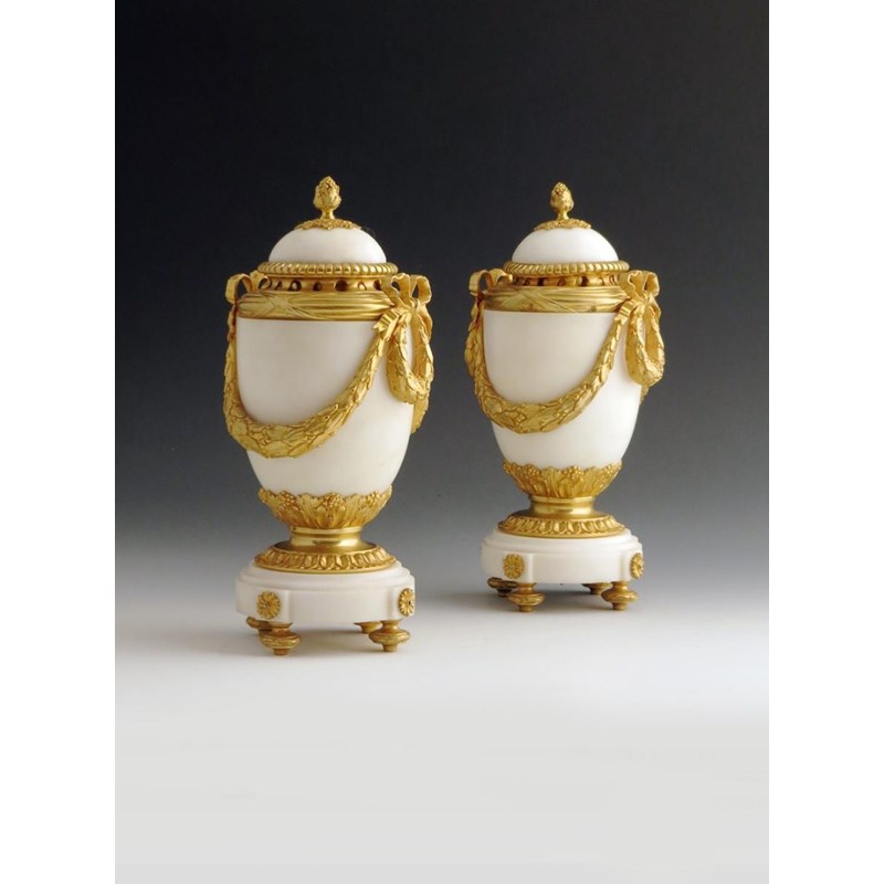 A pair of Louis XVI style ormolu and white marble perfume burners, the lid with a leaf wrapped cone finial above a body applied with ribbon tied laurel swags, on a leaf moulded base, late 19th century, 25.8cm high. (2)