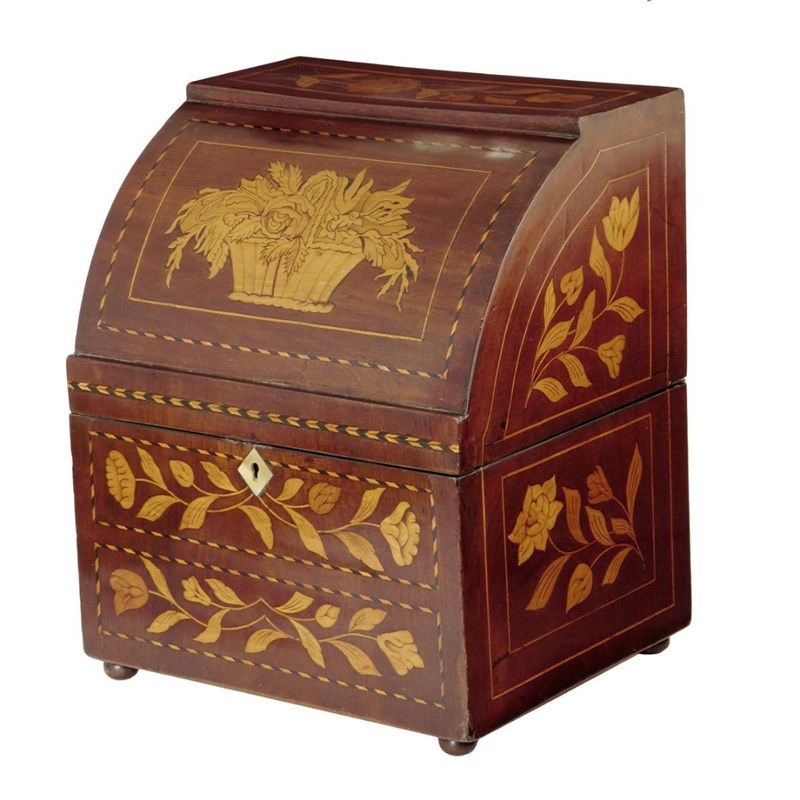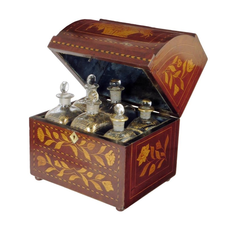 A 19th century Dutch mahogany and marquetry decanter box, inlaid with a basket of flowers and further panels of flowers and foliage, the plush lined interior fitted with six gilt decrorated glass decanters and stoppers, 28.4cm high 23.7cm wide, 19.9cm deep.