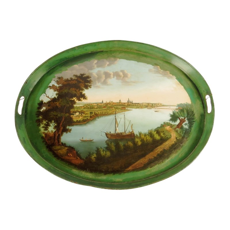 A 19th century tole peinte oval tray, painted green, the centre with a river city scape, possibly East European on the Danube, 58.5 x 71.1cm.