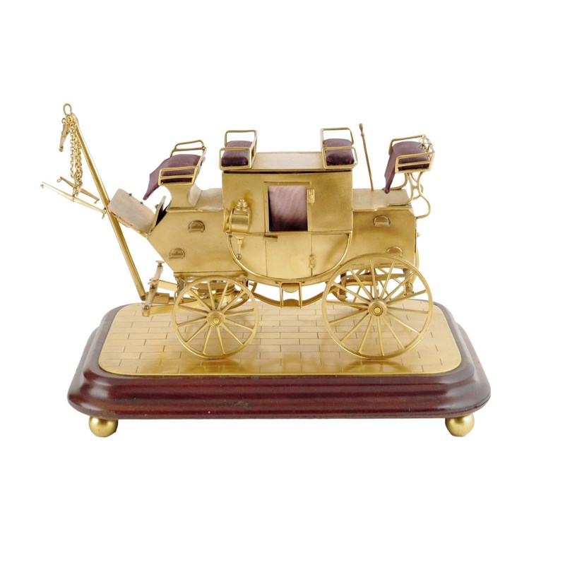 A gilt brass scale model of a 19th century carriage or coach, with hinged doors, mounted on a mahogany plinth with gilt ball feet, 20.8cm high, 32.8cm wide.