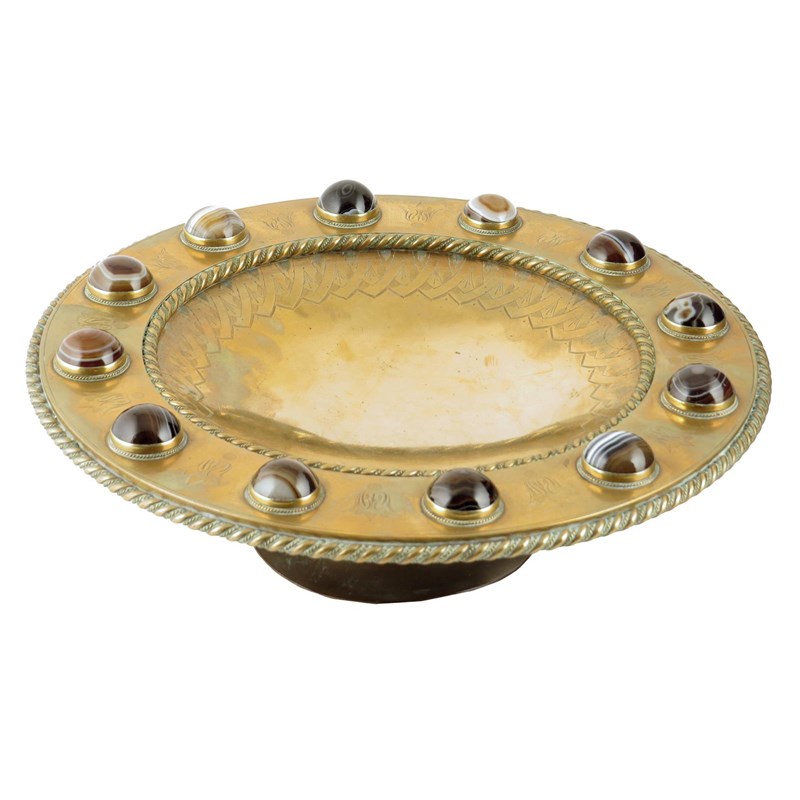 A Victorian gilt brass tazza, with engraved decoration and applied with agate cabochons, 10cm high, 31.3cm diameter.