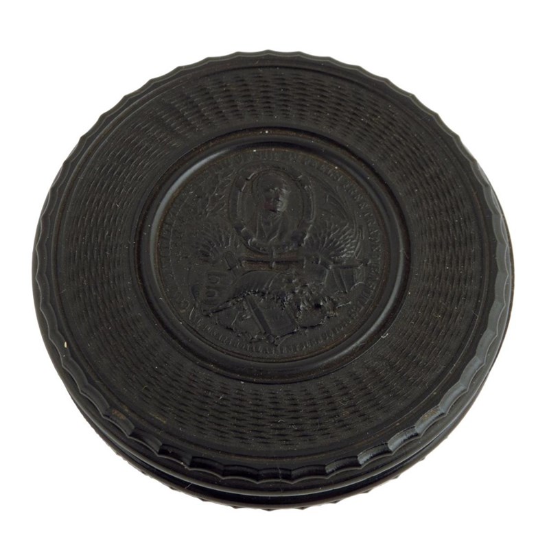 A Victorian commemorative turned ebony snuff box, the lid with a circular panel with a portrait bust, with sheaves of wheat and agricultural tools, inscribed 'TO COMMEMORATE THE PASSING OF SIR RBT PEELS FREE TRADE MEASURES', 7cm diameter.