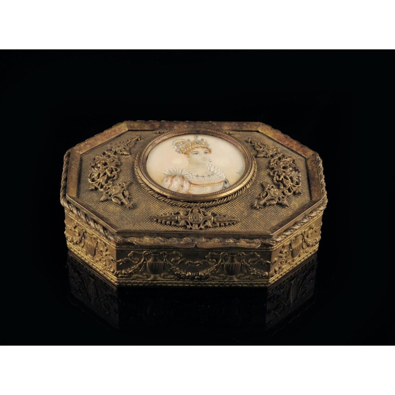 λ A late 19th century French gilt metal jewellery box, the hinged lid inset with a portrait miniature on ivory of a queen, signed 'Adart', with a plush lined interior, 11cm wide.