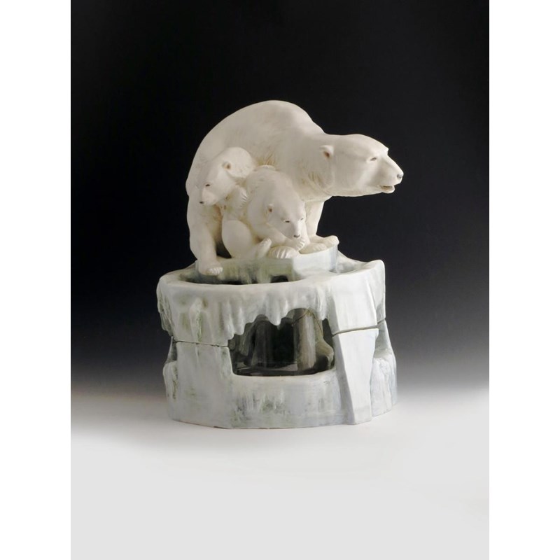 An Austrian pottery fishbowl, modelled with a polar bear and two cubs on an icy precipice, signed 'Marowicka', the interior with a glass bowl, the base with factory mark and inscribed 'VIENNA FAIENCE SCHAUER', with impressed marks 'D845F, DEPOSE 2363', early 20th century, 45.4cm high, 46m wide.