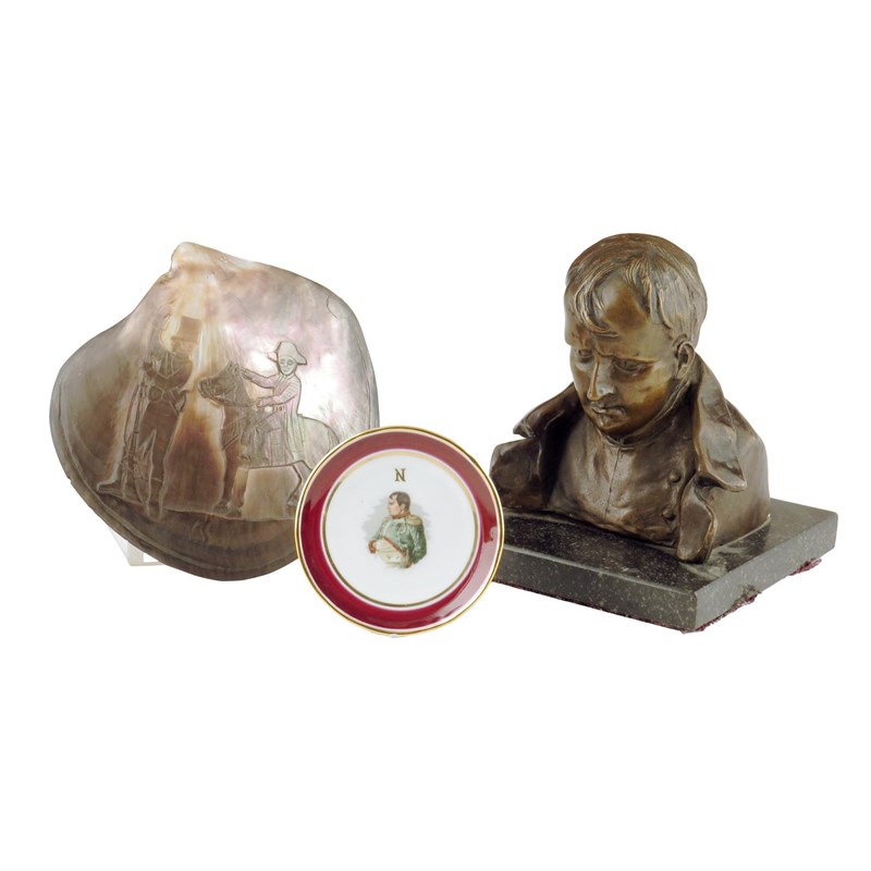 A bronze bust of Napoleon, on a marble plinth, 18.2cm high, together with a South Sea Island carved mother of pearl shell depicting Napoleon on horseback, titled and a French porcelain small plate printed with a portrait of Napoleon, gilt marks 'PORCELAINE DE LUXE'. (3)