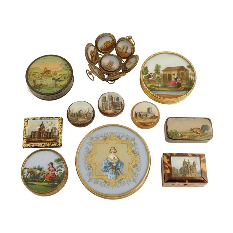λ A 19th century French card and brass chocolate box, the lid with a printed portrait of a lady behind glass, the base with a printed label 'Au Fidele Berger, Yve AUCLER & P. LEDOUX, Rue des Lombards 46 & 48 Paris', two similar boxes one with a printed river scene with two figures, the other with a girl with a dog, a French gilt brass dish with printed views of Paris landmarks, three English pin cushions with reverse glass prints including Brighton Pavilion, a tortoiseshell box and a papier-mache plaque with a view of St. Paul's Cathedral together with two snuff boxes, 11.8cm wide (max). (11)