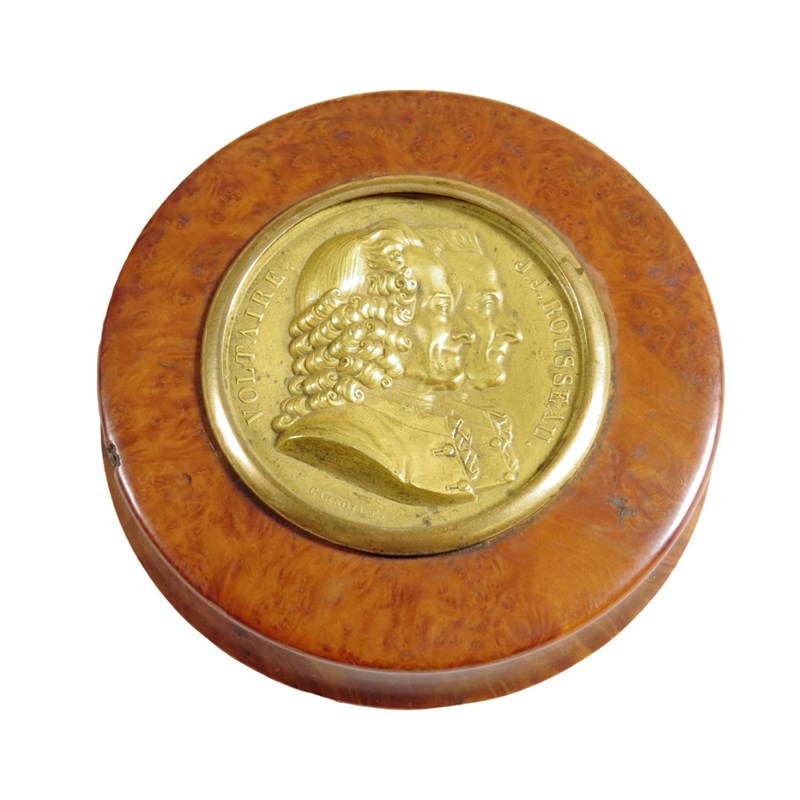 A 19th century French burr maple snuff box, the lid inset with a gilt bronze double portrait relief medallion of Voltaire and Rousseau after Francois Caunois, signed, with a tortoiseshell lined interior, 8cm diameter.