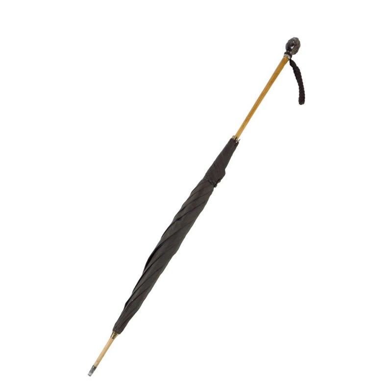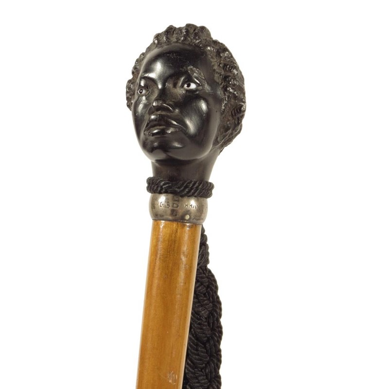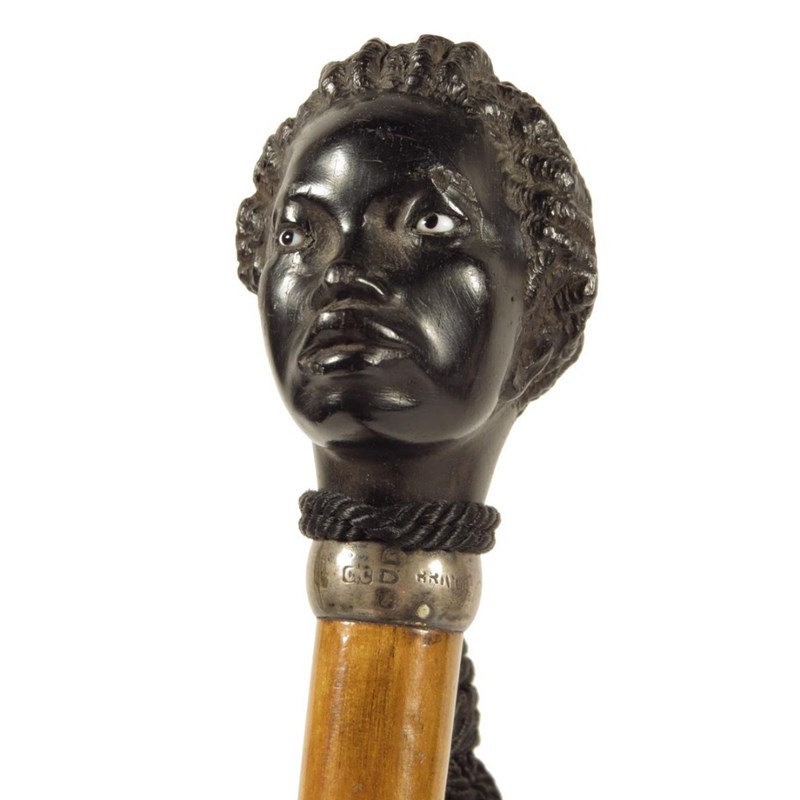 An Edwardian umbrella by Brigg, the ebony handle carved with a man's head with glass eyes above a silver ferrule, hallmarked London 1902, with a silk canopy, 97.4cm long.